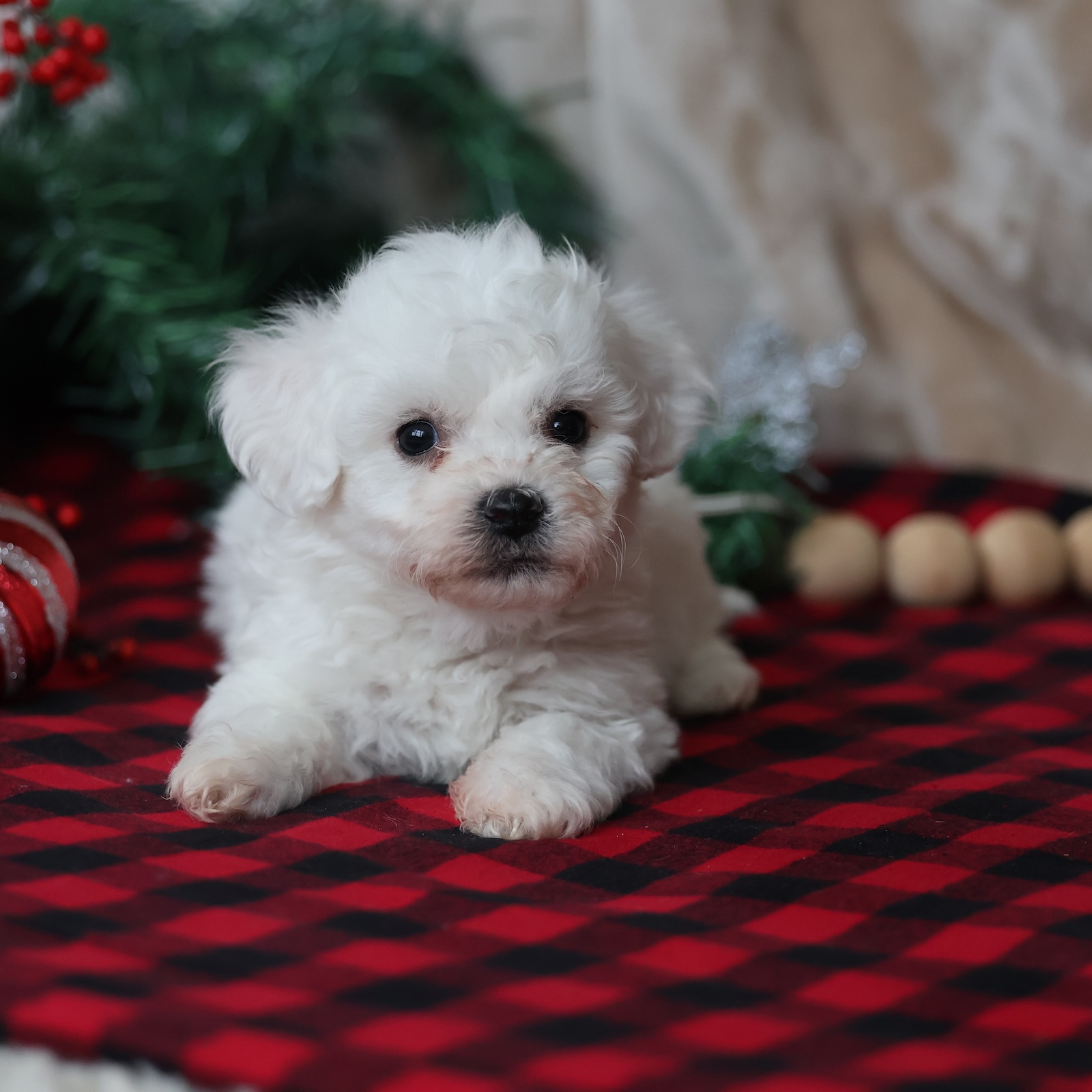 Timber is a fluffy little Bichon boy with a heart as soft as his coat. He’s the kind of puppy who makes everything feel calmer just by being near you. Timber loves gentle play, but his true favorite thing is snuggling up close — whether that’s in your lap, beside your feet, or curled into a cozy blanket. He has an easygoing, happy nature that fits perfectly into family life, and he’s already showing that classic Bichon trait of being friendly with everyone he meets. Timber is a sweet soul, full of comfort and quiet joy — a Puppy Dreams pup who’s ready to bring warmth to your home.