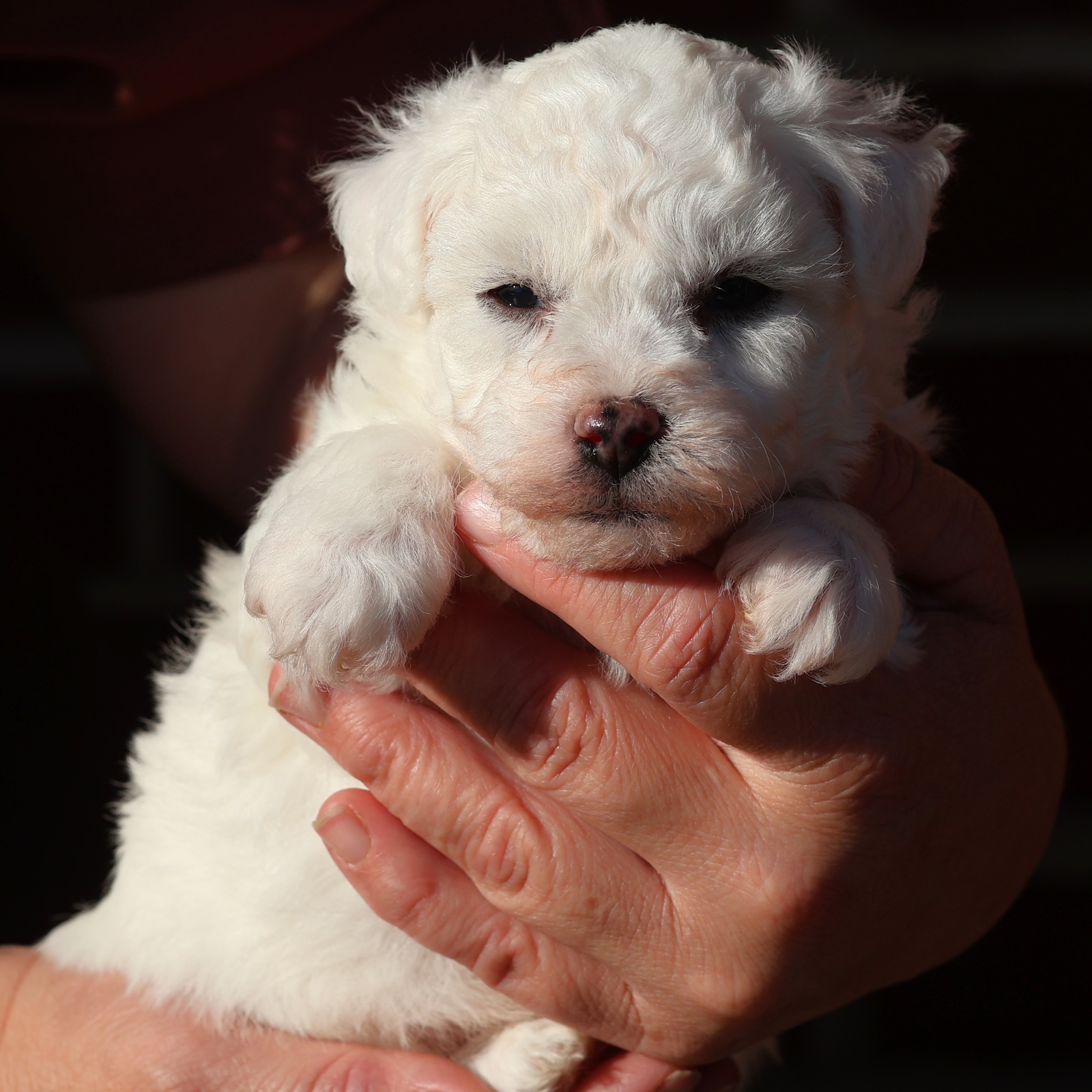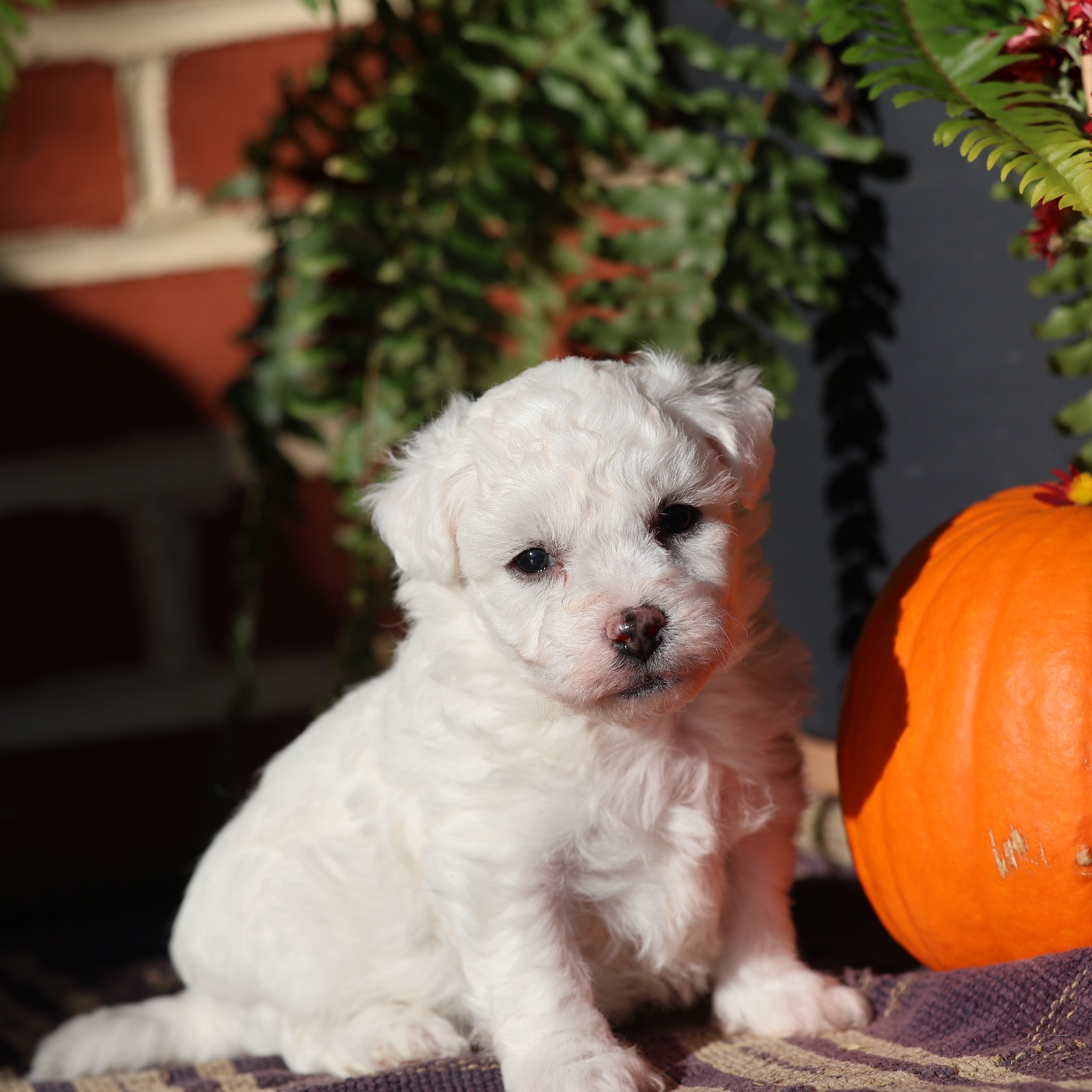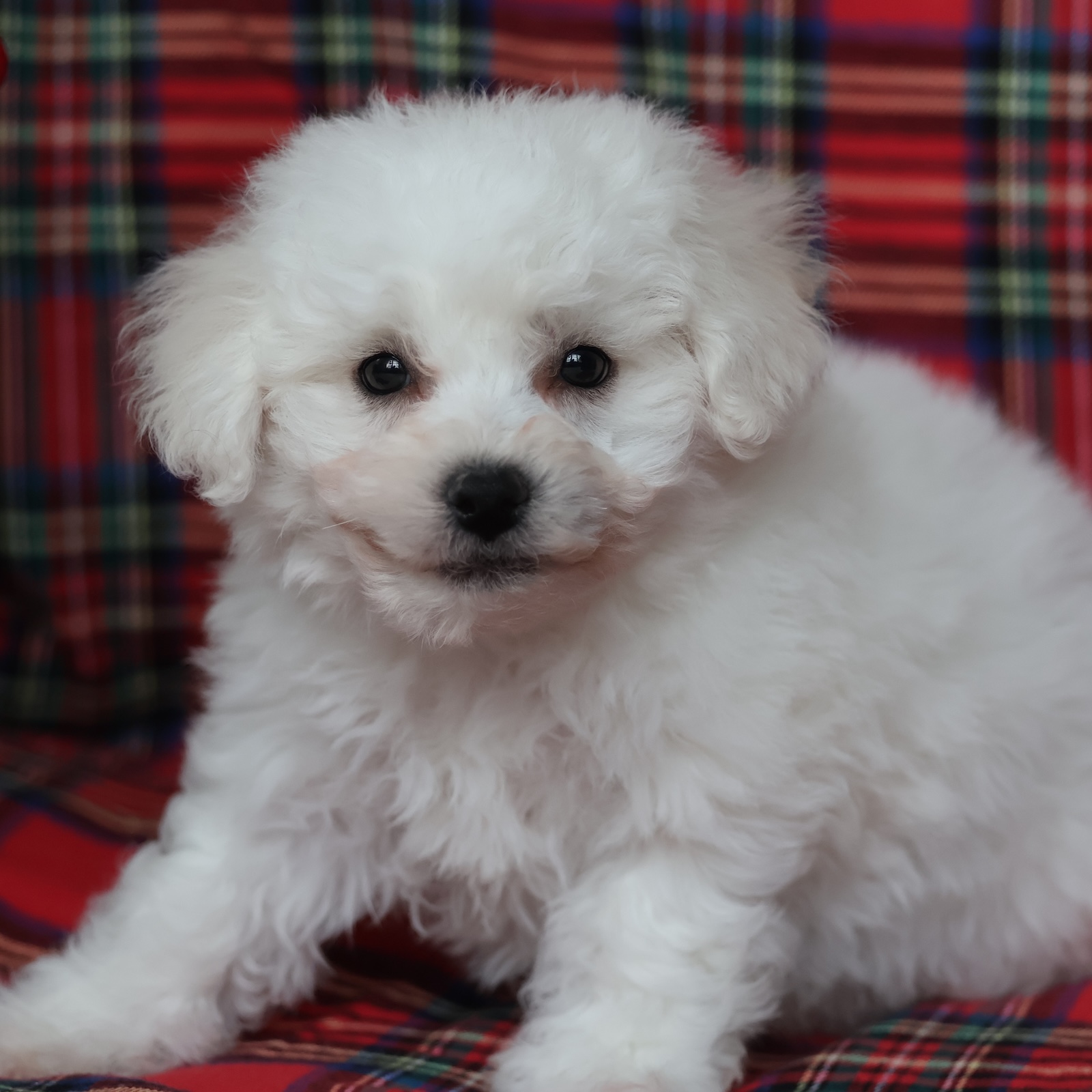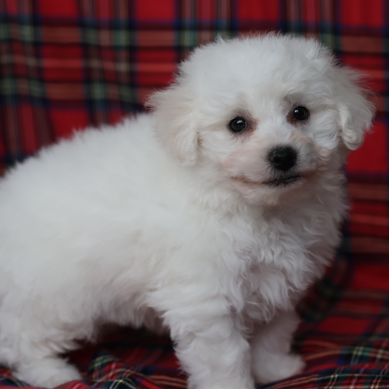 Georgie is pure sunshine wrapped in a soft, cloudlike coat. This cheerful little Bichon Frise has an irresistible sparkle in his eyes and a playful bounce that can brighten even the dullest day. Every moment is an adventure for Georgie—he loves chasing after toys, trotting proudly beside his favorite humans, and turning every corner of the home into a playground. Beneath his playful spirit lies a deeply affectionate heart; he adores being held, cuddled, and told how handsome he is. With his joyful personality and endless sweetness, Georgie is the kind of puppy who makes every day feel a little lighter, warmer, and full of love.