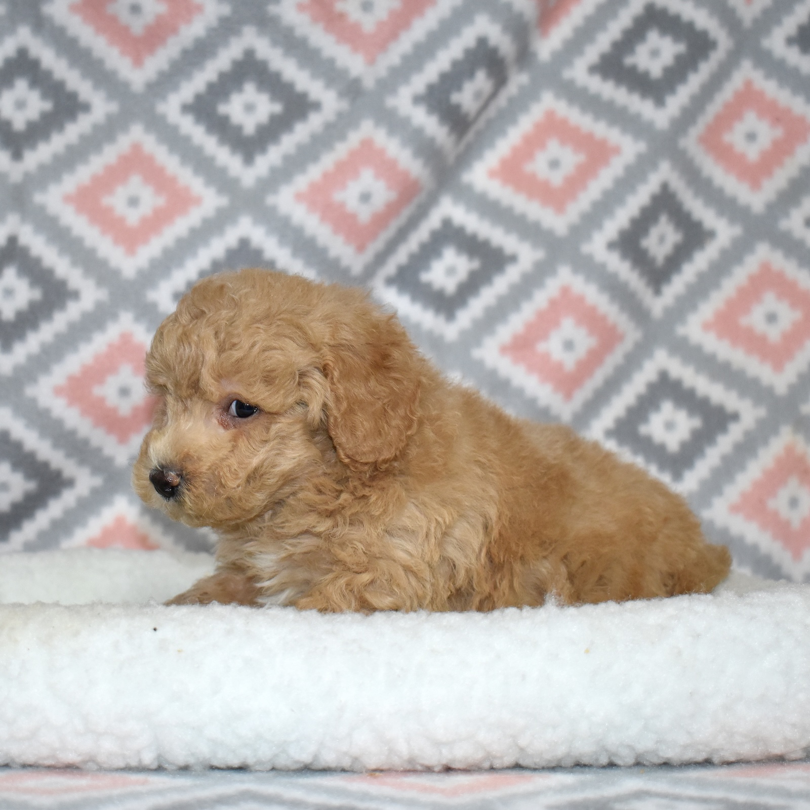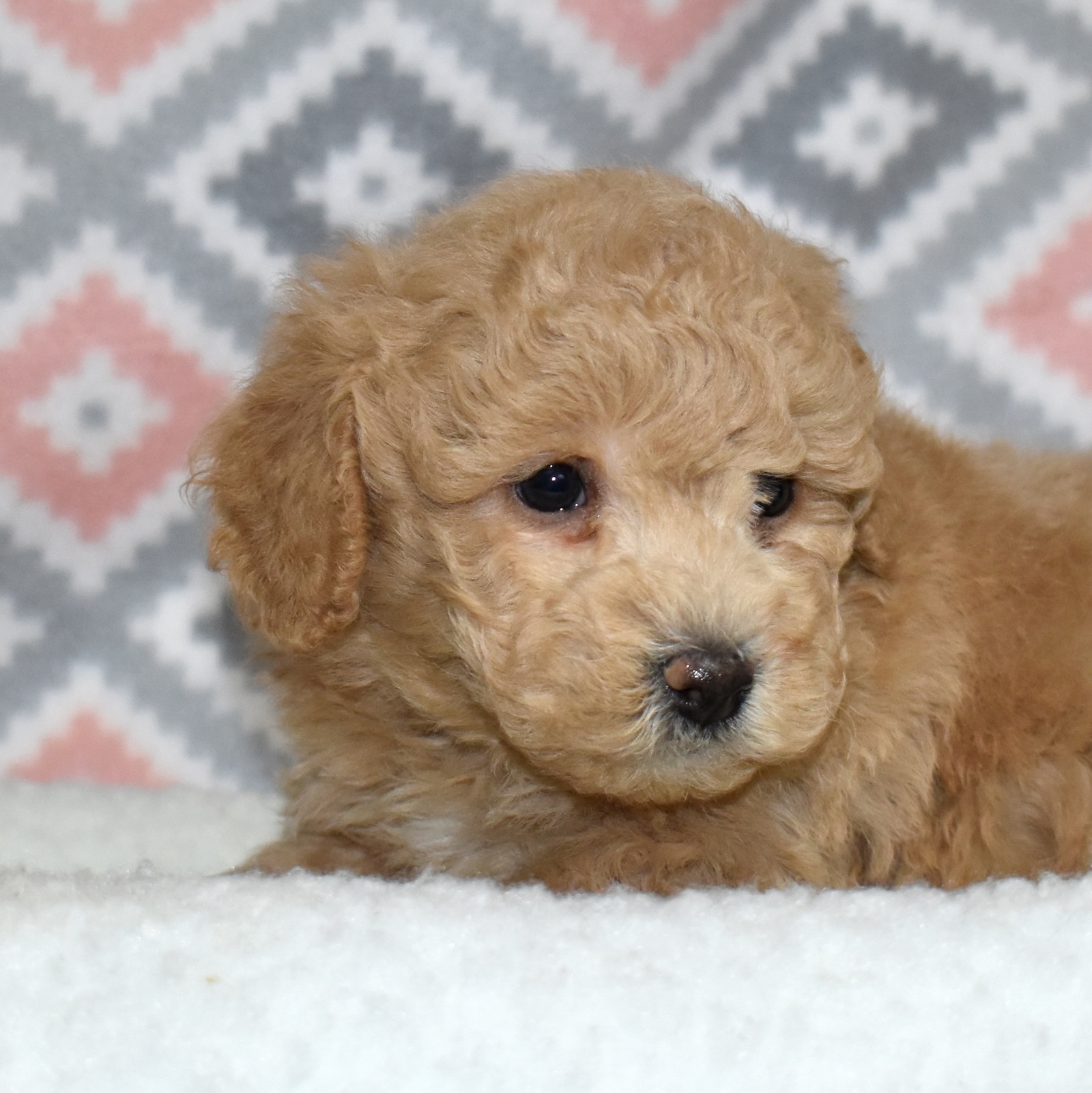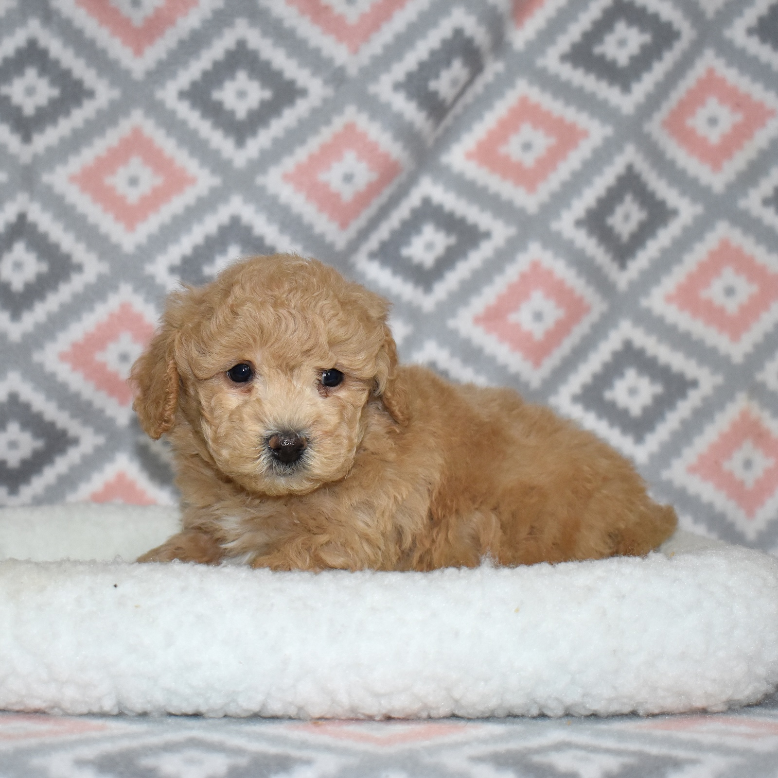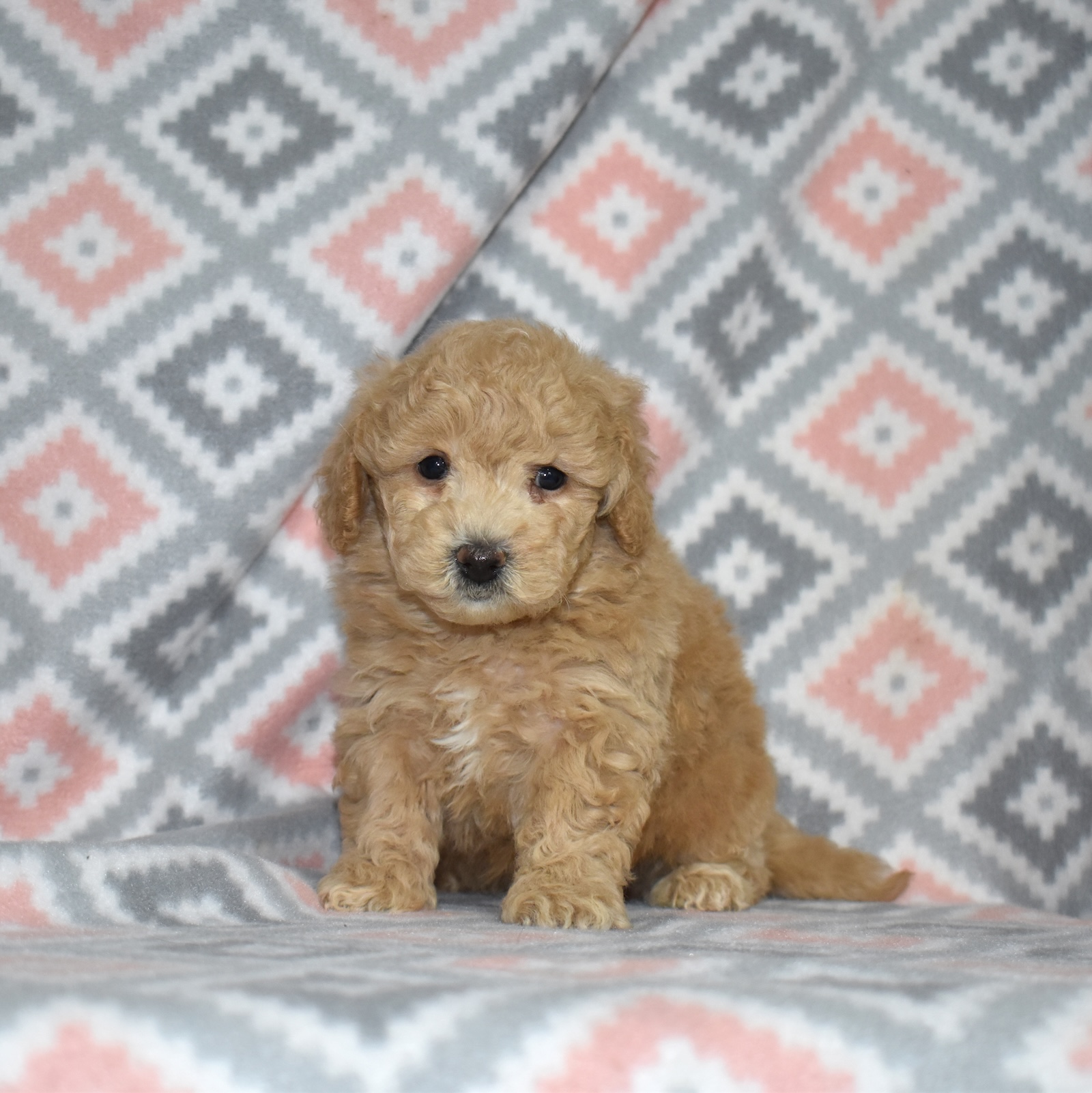 Petey is a lovable Bich Poo puppy with a golden coat and eye-catching white markings. He has a silly, joyful personality that makes him a constant source of smiles. Petey loves to play, explore, and share affection.