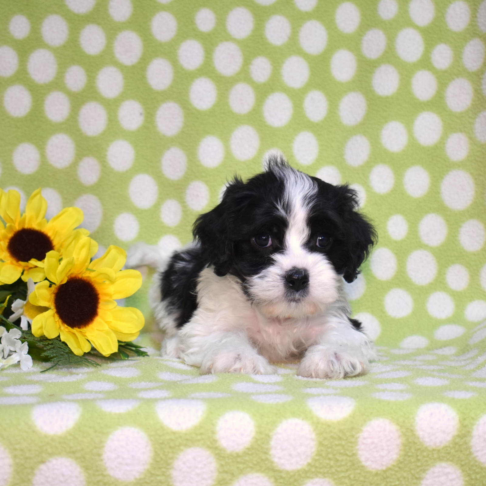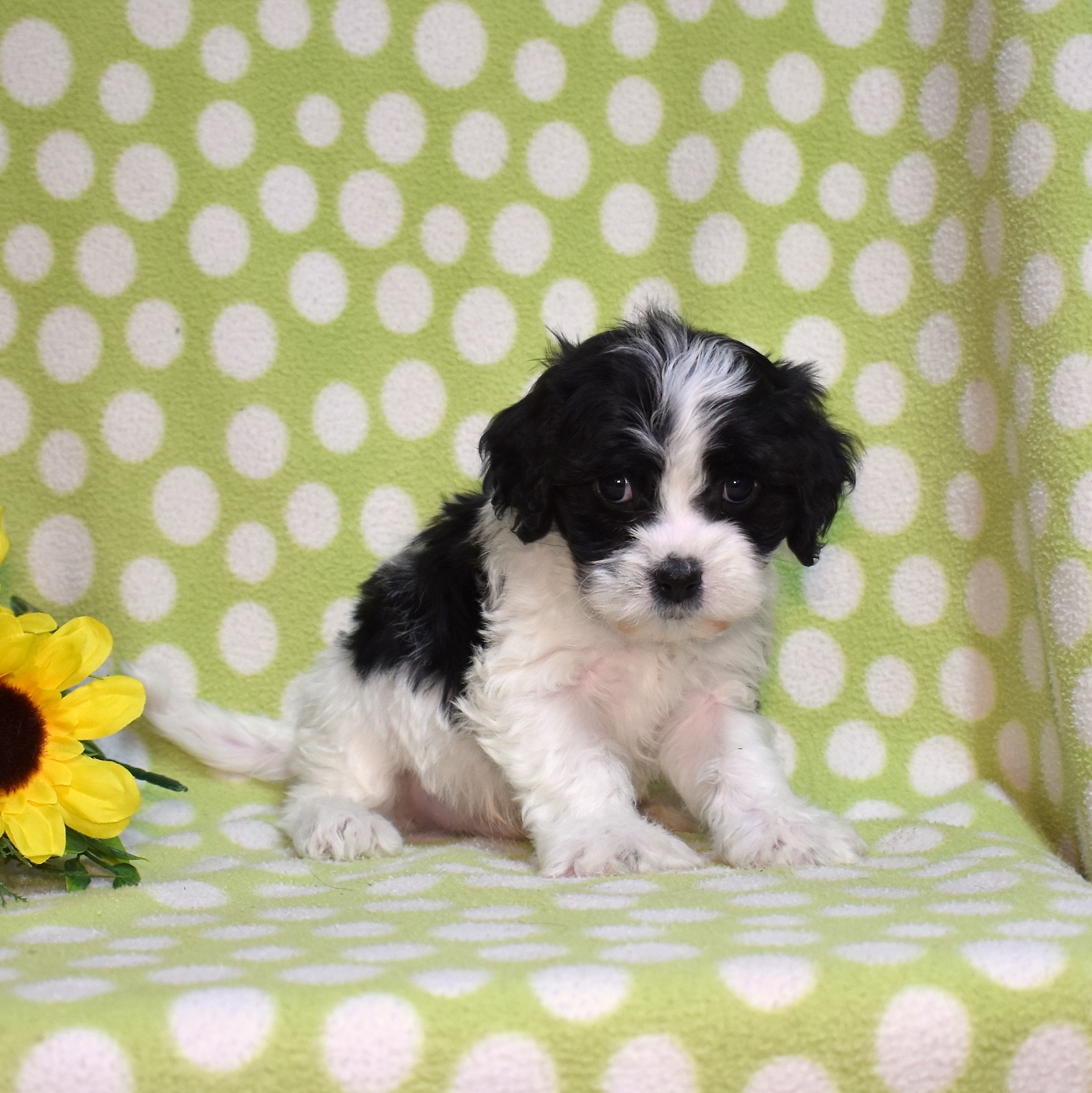 Thumper is a playful Cavachon whose lively personality keeps everyone smiling. His white coat with black markings gives him a charming and distinctive appearance.