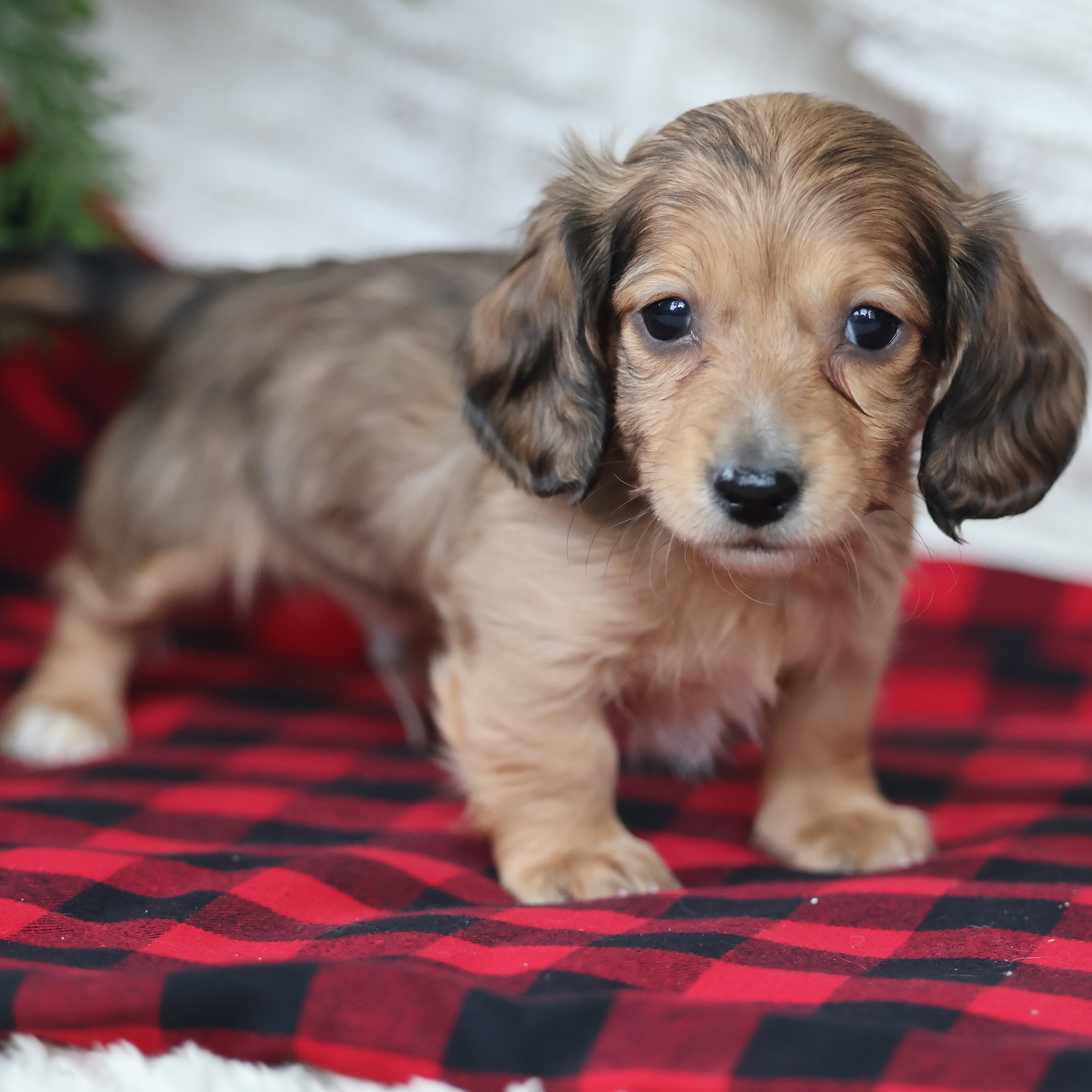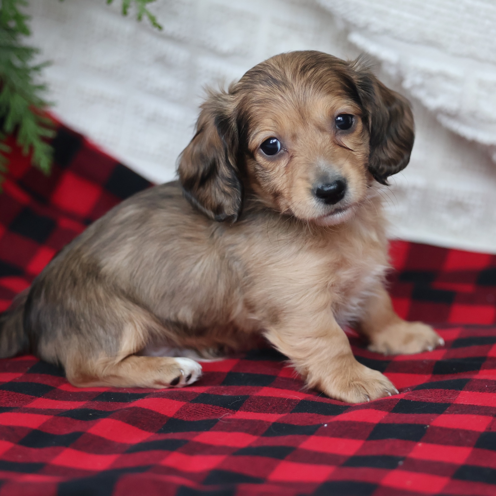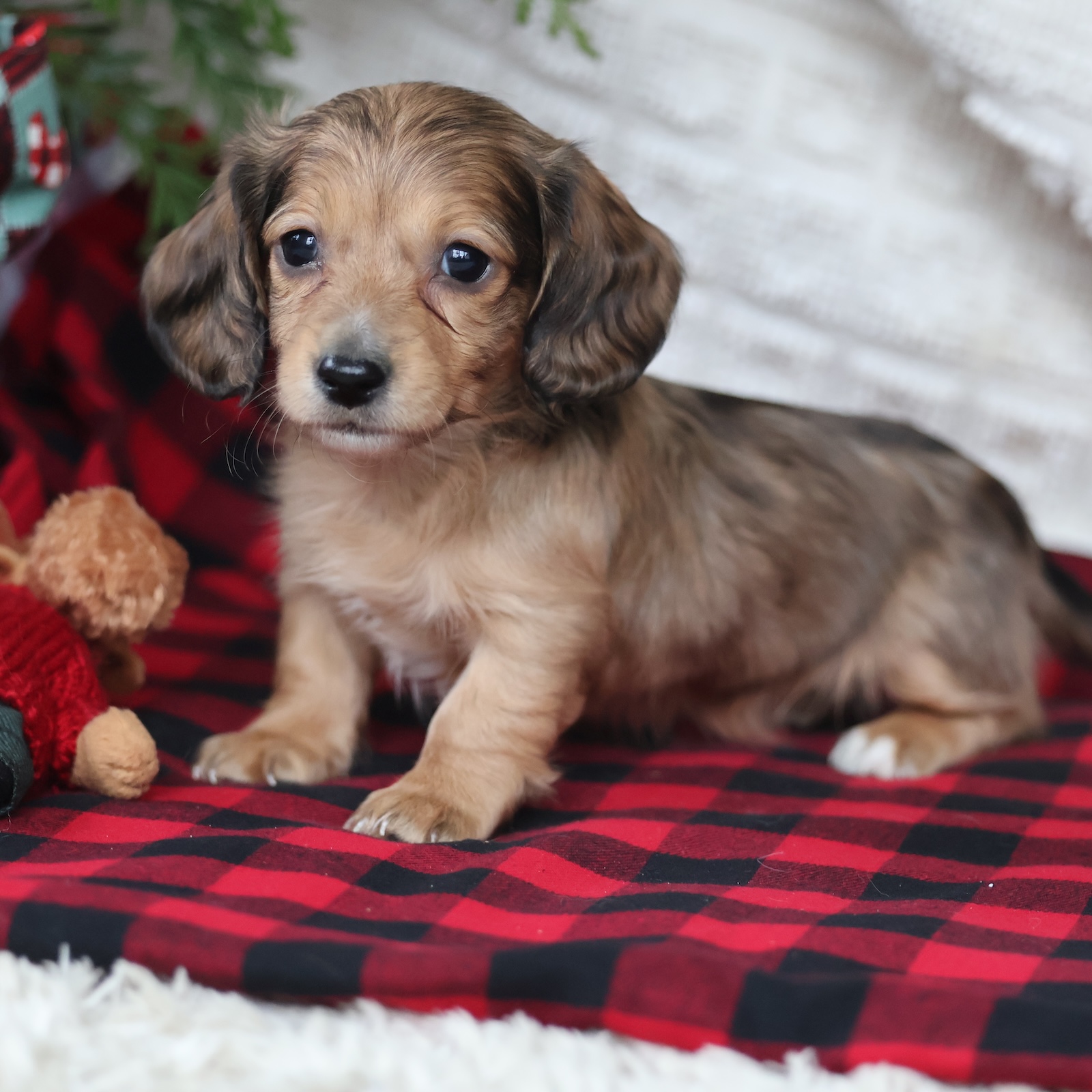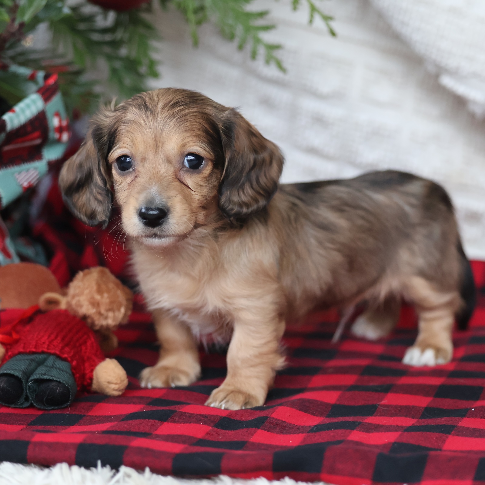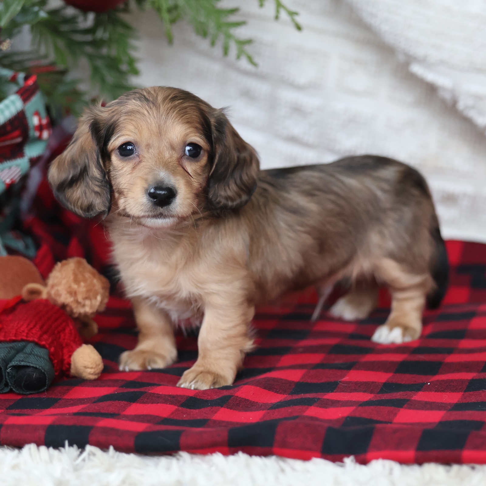 Spruce is a stunning tan dapple long-haired Dachshund male with a gentle heart and an intelligent, curious personality. His soft coat and beautiful markings give him a refined, elegant look, while his warm eyes show just how affectionate he truly is. Spruce enjoys exploring his surroundings, playing with toys, and engaging in lighthearted adventures. He’s a thoughtful little puppy who likes to observe before diving in, making him a great match for families who appreciate a calm, attentive companion. Spruce also loves snuggle time and will gladly curl up beside you after an exciting day. His long coat adds to his charm and only enhances his sweet presence. As a loyal and loving Dachshund, Spruce forms deep bonds and enjoys being close to his people. He brings a peaceful, comforting energy to the home while still delivering plenty of playful moments. With his gentle spirit and loving personality, Spruce is ready to become a cherished member of a lucky family.