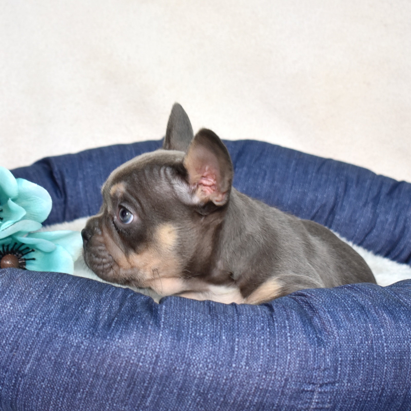 Denim is a cool, relaxed little gentleman with a beautiful black and tan coat that highlights his expressive face. His coloring gives him a classic French Bulldog look, while his personality adds a layer of warmth and comfort that makes him unforgettable.