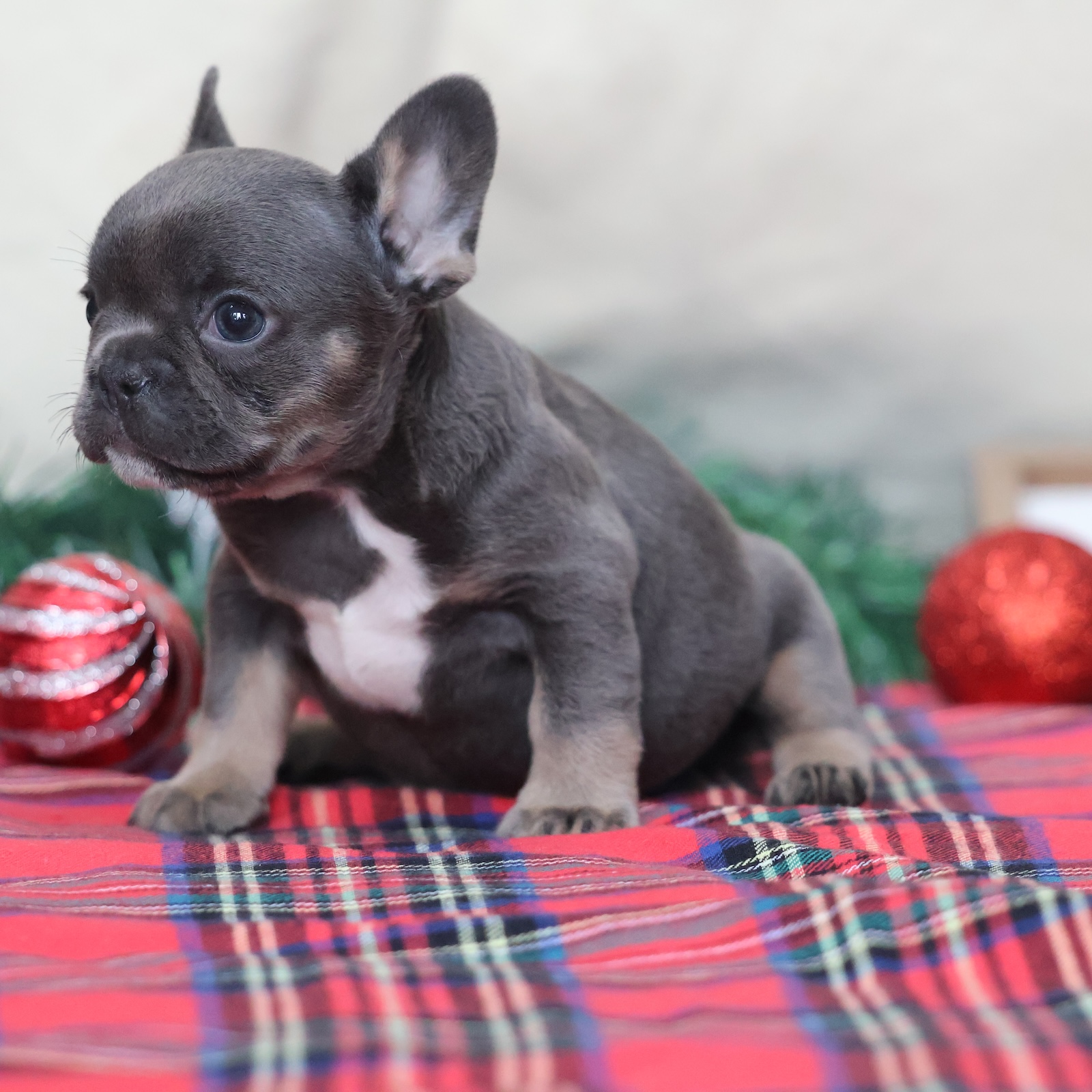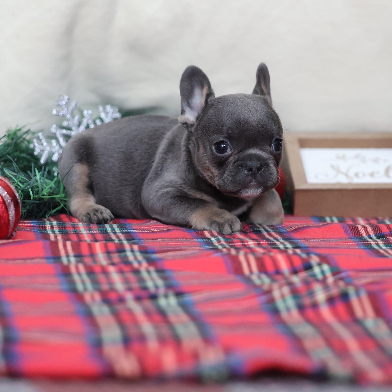 April is a bright little Frenchie girl who feels like the joyful spark of the season. With her black and tan coat, she looks polished and festive—like holiday cocoa with a swirl of cream—and her name suits her sunny spirit. At Puppy Dreams, April is the pup who brings the party in the sweetest way. She’s playful, curious, and full of happy wiggles, always ready to explore crinkly toys or chase a soft ball across the room.