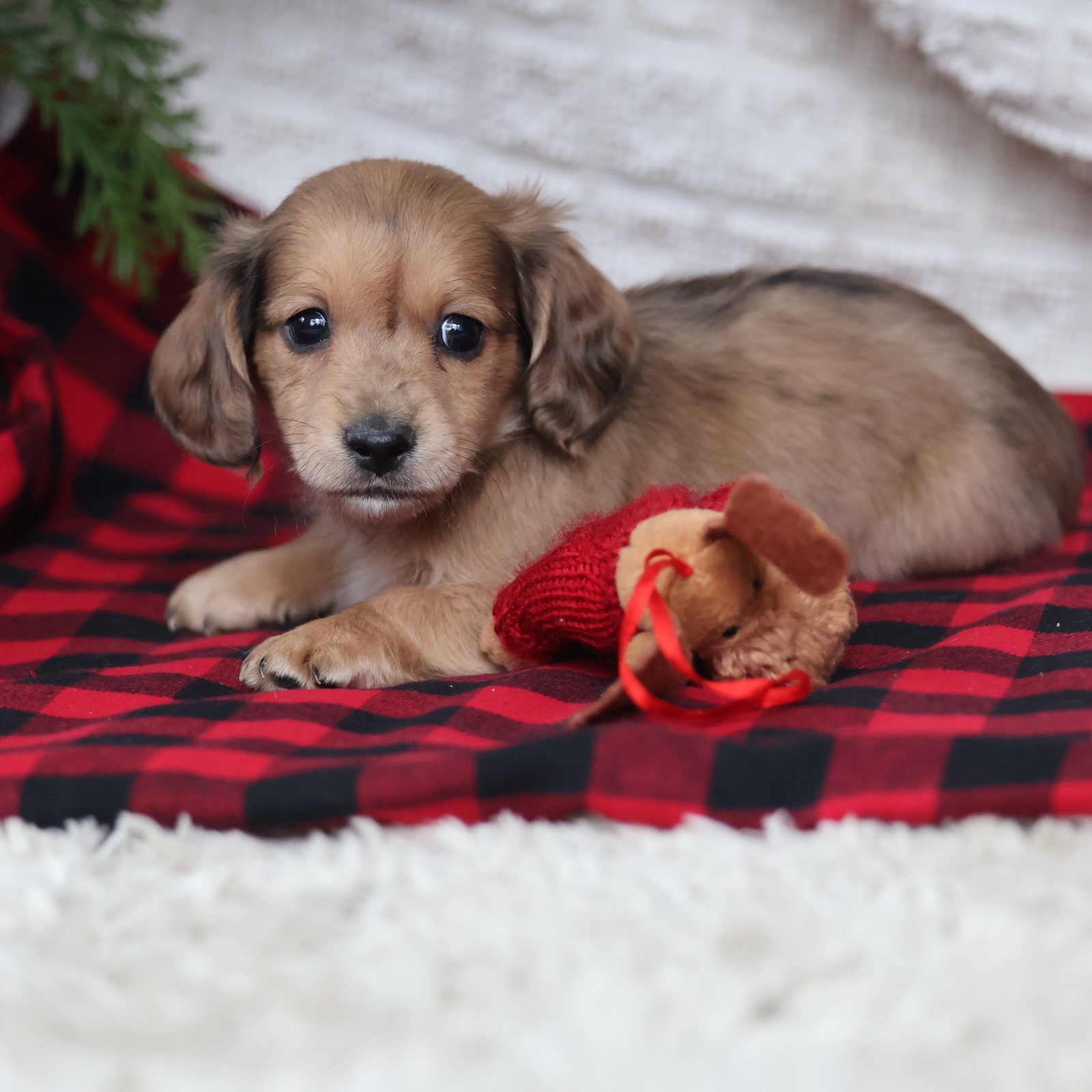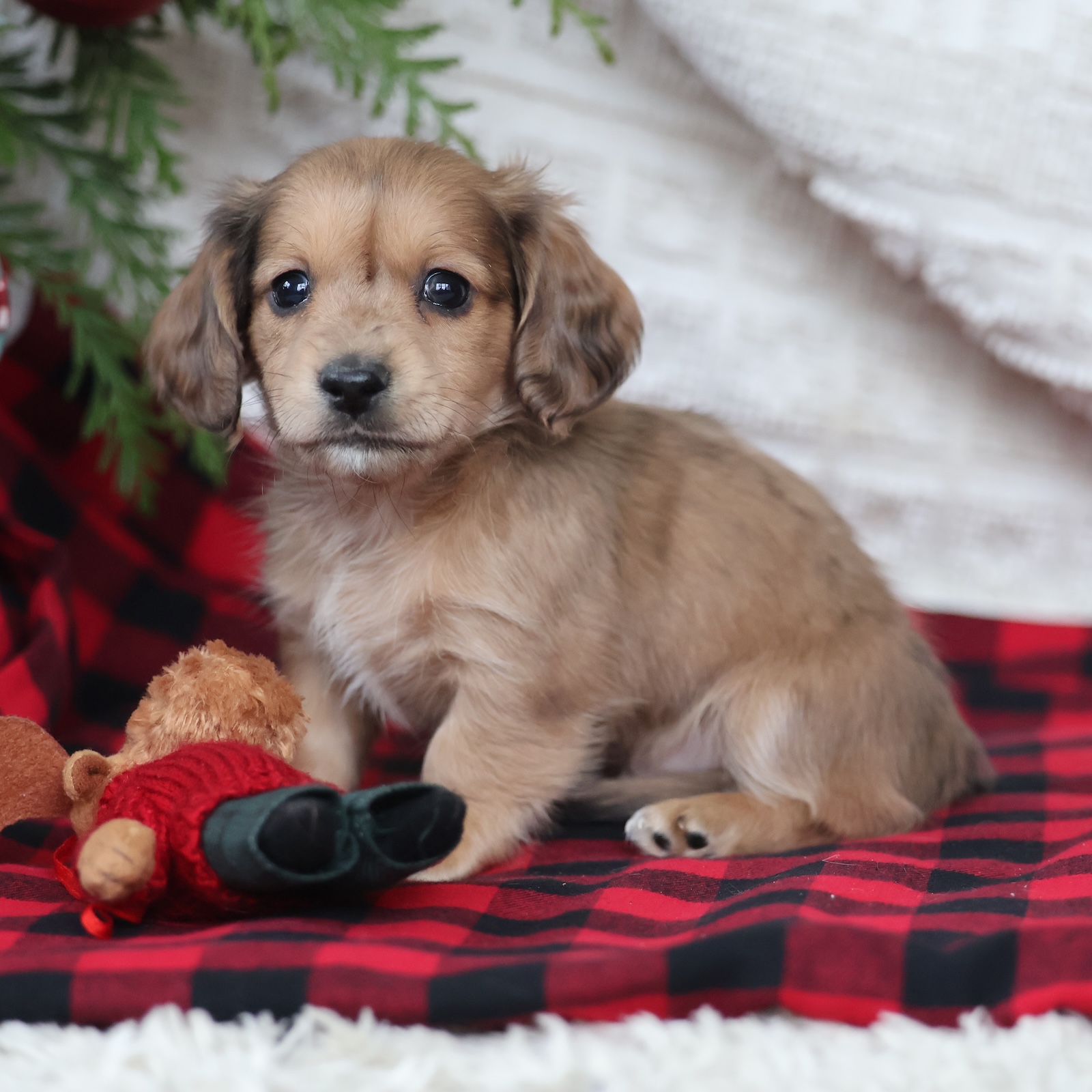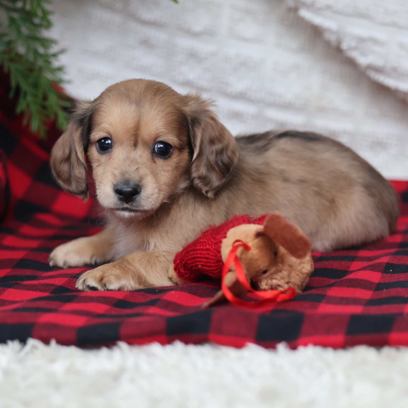 Jingle is a charming tan dapple long-haired Dachshund boy whose soft coat and striking pattern make him a true little showstopper. He’s full of life and has a playful, merry spirit—just like his name suggests. Jingle loves exploring new toys, meeting new people, and discovering the world around him with confidence and enthusiasm. But after a fun play session, he’s more than happy to snuggle close and enjoy calm moments with his family. His long, silky fur adds elegance to his cheerful personality, giving him the perfect balance of cute and classy. Dachshunds are known for their intelligence and loyalty, and Jingle displays both naturally. He enjoys learning, bonding, and being part of the action. With his bright eyes and loving temperament, he’s sure to bring warmth, laughter, and affection to his forever home. Jingle is the ideal companion for anyone looking for a joyful little friend with a big heart.