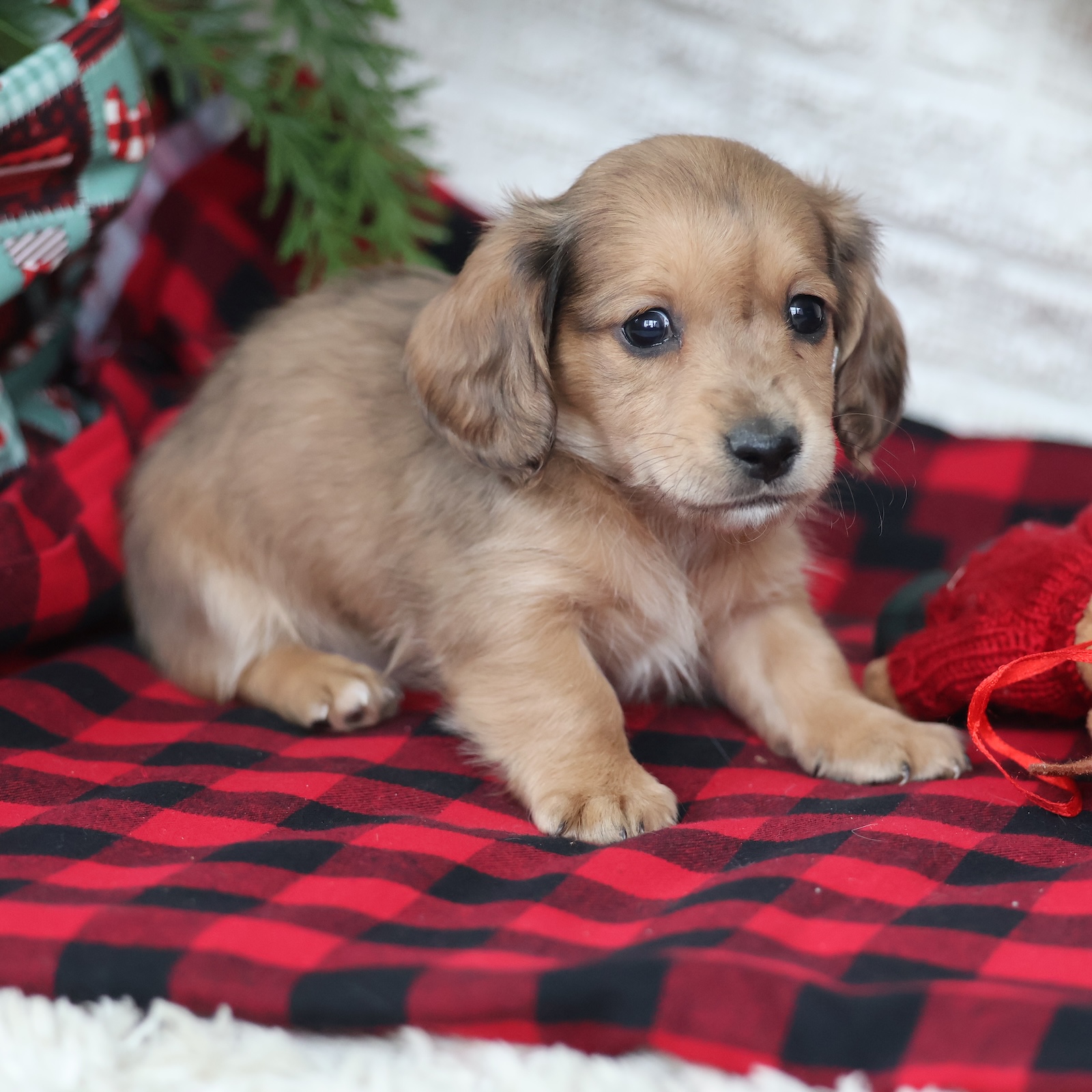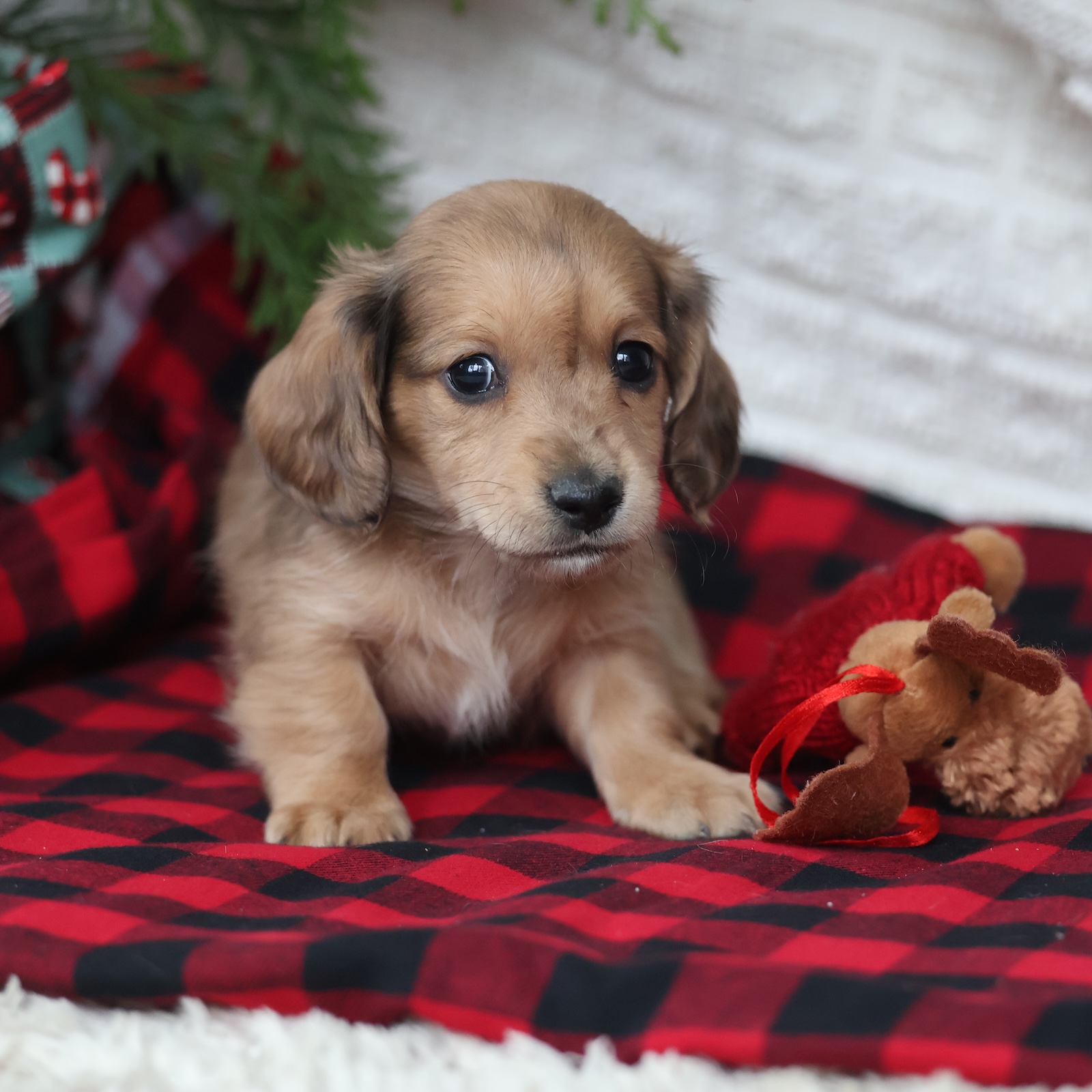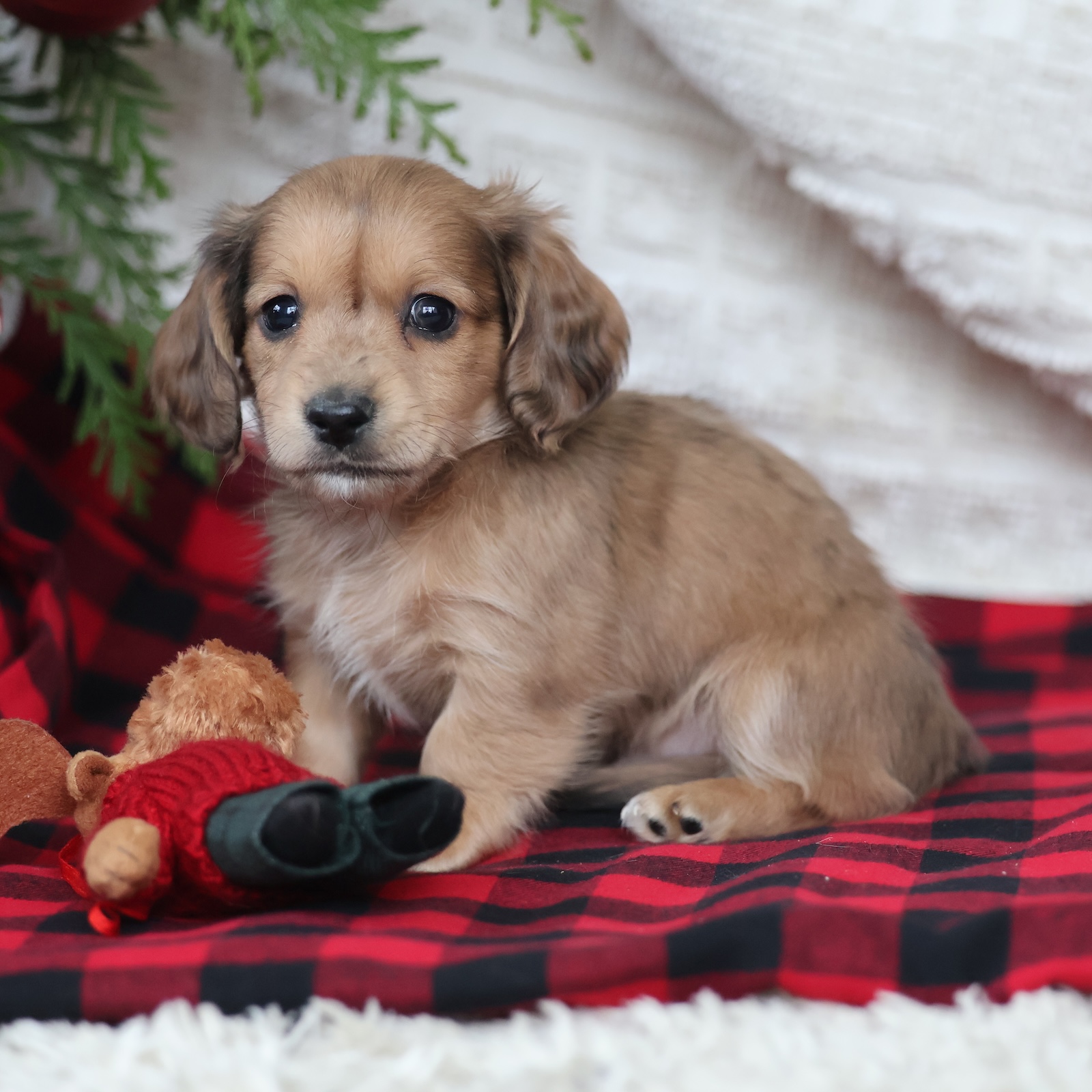 Jingle is a charming tan dapple long-haired Dachshund boy whose soft coat and striking pattern make him a true little showstopper. He’s full of life and has a playful, merry spirit—just like his name suggests. Jingle loves exploring new toys, meeting new people, and discovering the world around him with confidence and enthusiasm. But after a fun play session, he’s more than happy to snuggle close and enjoy calm moments with his family. His long, silky fur adds elegance to his cheerful personality, giving him the perfect balance of cute and classy. Dachshunds are known for their intelligence and loyalty, and Jingle displays both naturally. He enjoys learning, bonding, and being part of the action. With his bright eyes and loving temperament, he’s sure to bring warmth, laughter, and affection to his forever home. Jingle is the ideal companion for anyone looking for a joyful little friend with a big heart.