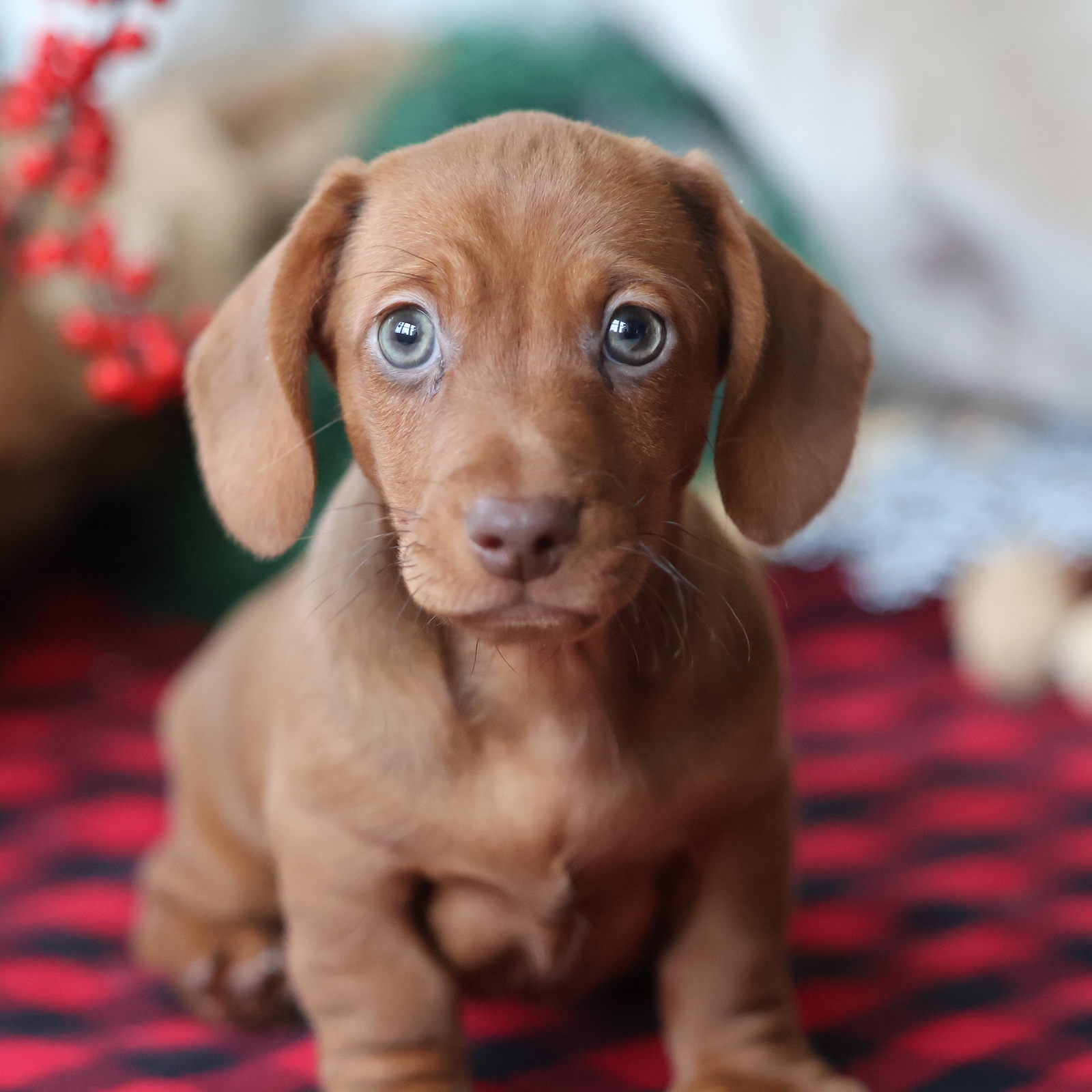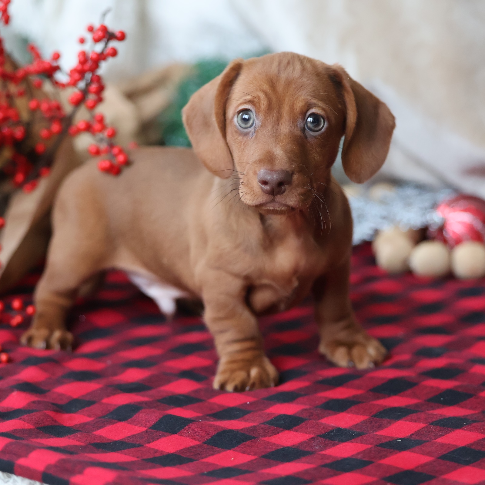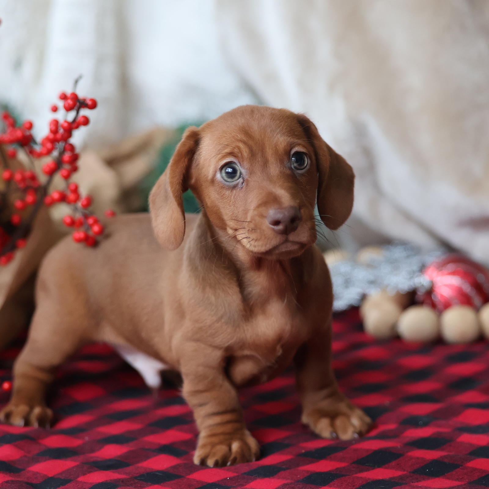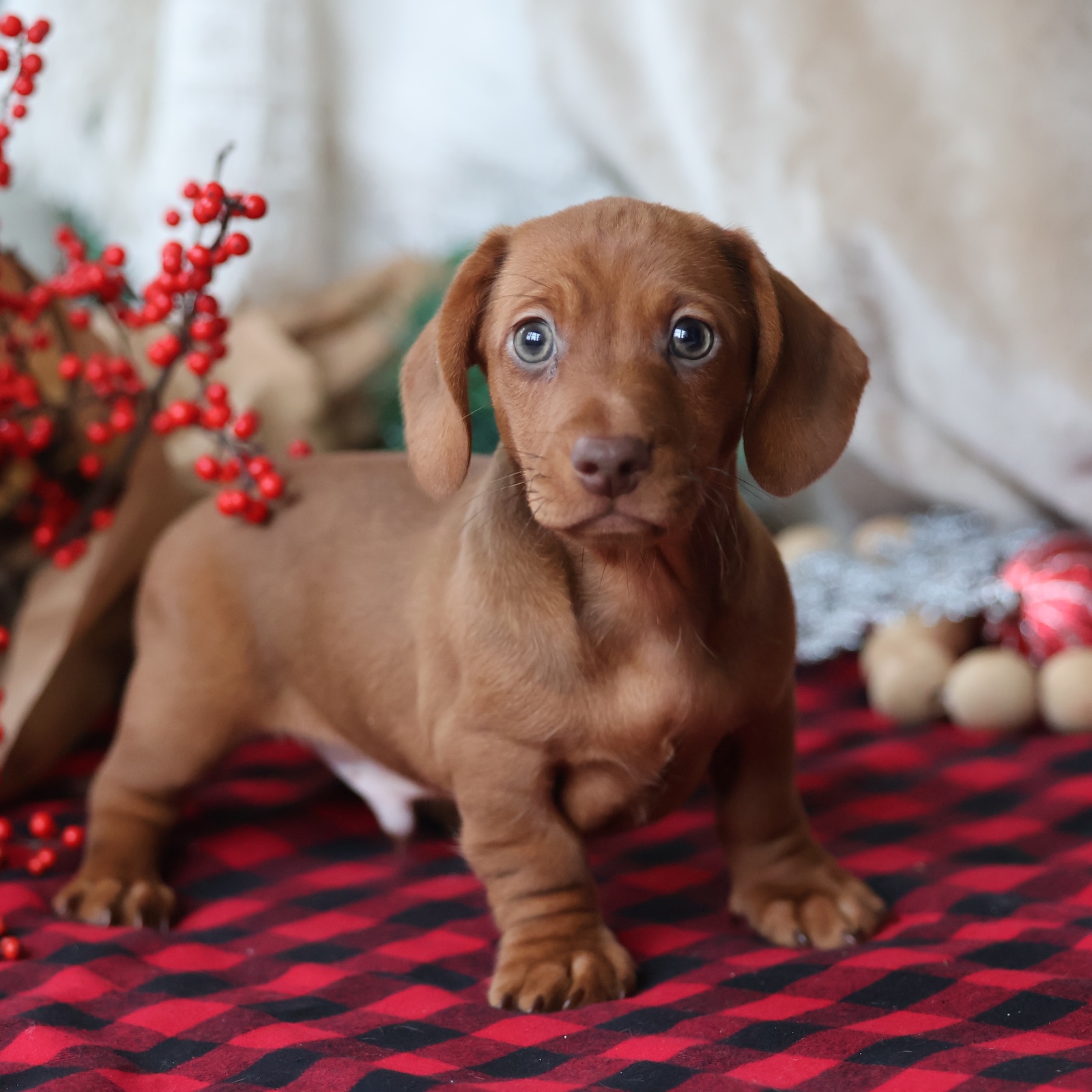 Rudolph is a handsome red short-haired Dachshund boy with a classic look and a heart full of charm. His sleek, glossy coat gives him a refined appearance, while his warm eyes reveal a sweet and affectionate personality. Rudolph loves being close to his people and is happiest when he can curl up in your lap or follow you from room to room. Playful but gentle, he enjoys exploring new spaces, chasing soft toys, and greeting everyone he meets with a friendly tail wag. This little guy is confident without being rowdy and loves both cuddle time and adventure. Dachshunds are known for their loyalty, and Rudolph is no exception—he bonds quickly and thrives on companionship. His compact size and low-maintenance coat make him a great fit for families, couples, or individuals looking for a devoted companion. Whether he’s strutting proudly beside you or snoozing peacefully at your feet, Rudolph brings joy everywhere he goes. He’s the perfect blend of spirited and sweet, ready to fill his forever home with warmth, laughter, and unconditional love.