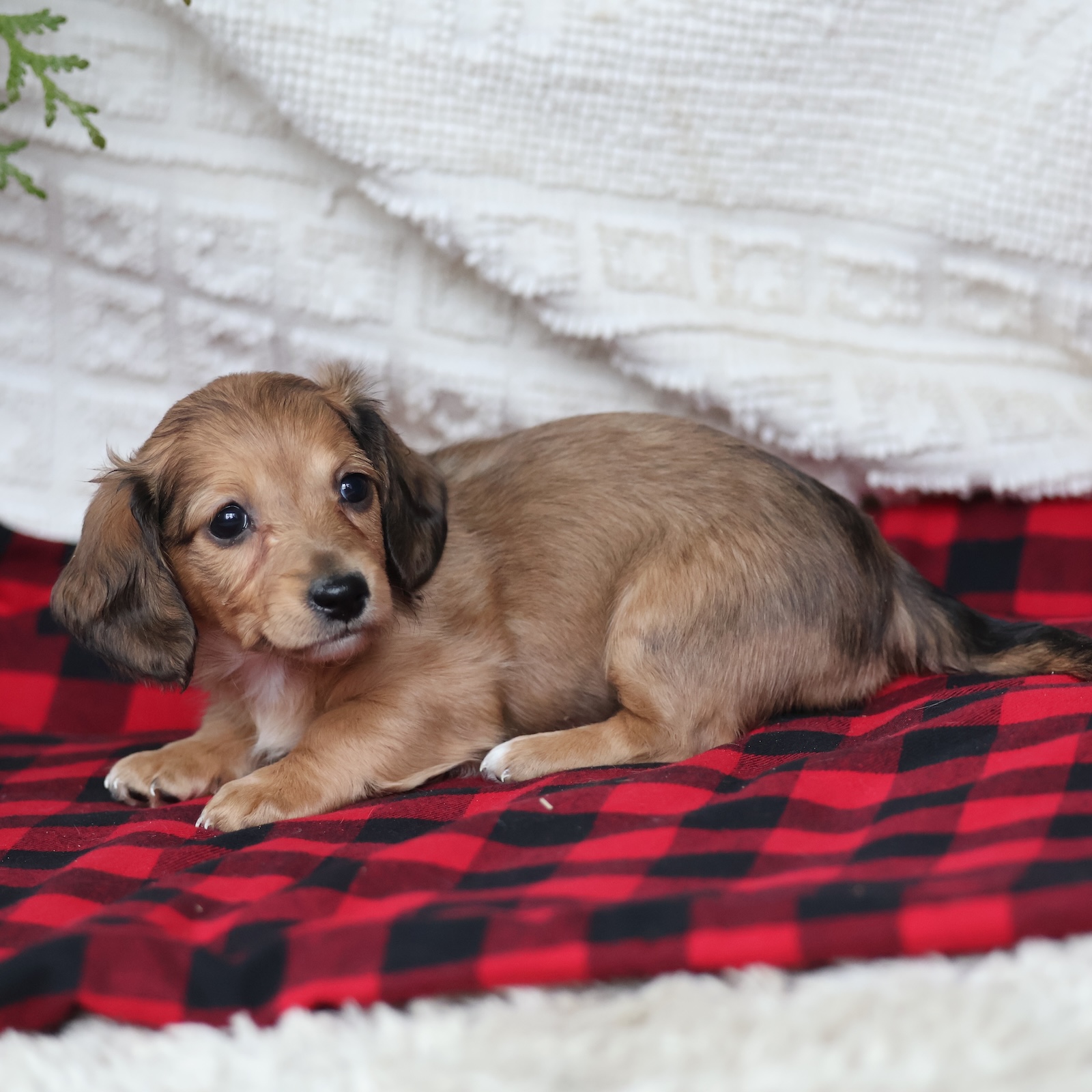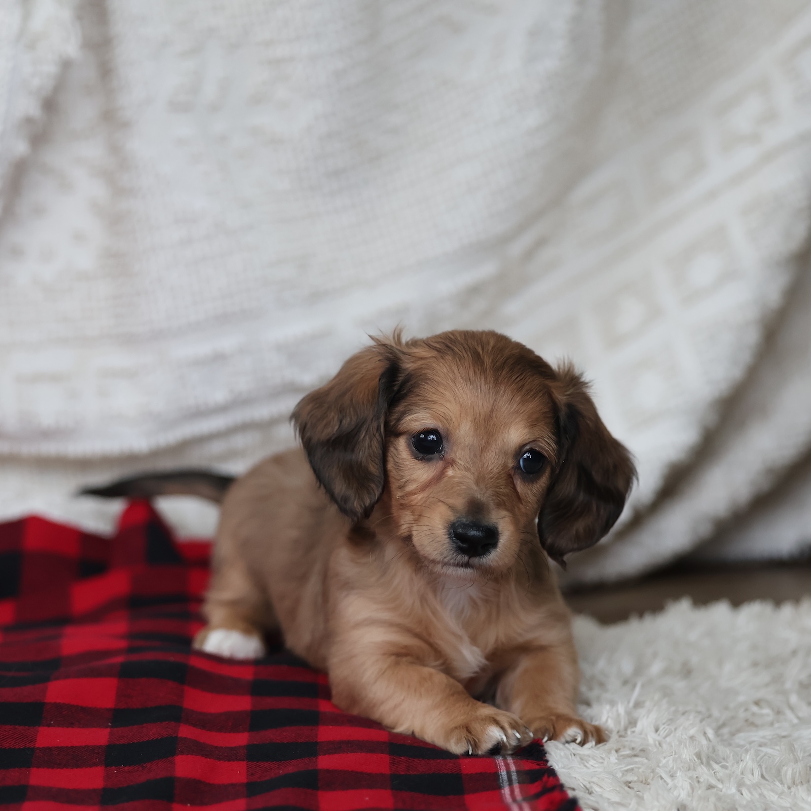 Holly is a beautiful tan dapple long-haired Dachshund with a soft, flowing coat and the sweetest, most gentle demeanor. She captures hearts instantly with her delicate coloring and thoughtful, expressive eyes. Holly is calm, affectionate, and loves being held, making her an ideal companion for anyone who enjoys quiet cuddles and constant companionship. Though she has a mellow personality, she still enjoys playful moments—especially when soft toys or gentle games are involved. Dachshunds are known for their loyalty, and Holly forms strong bonds with the people she trusts. Her long, silky fur adds to her elegance, giving her a graceful look that matches her tender personality. Holly thrives on attention and enjoys being close to her humans, whether she’s lying beside you or curled up comfortably in your arms. With her loving spirit and gentle nature, Holly is sure to bring peace, joy, and warmth to her future family. She is the perfect little sweetheart ready to begin a lifetime of love.